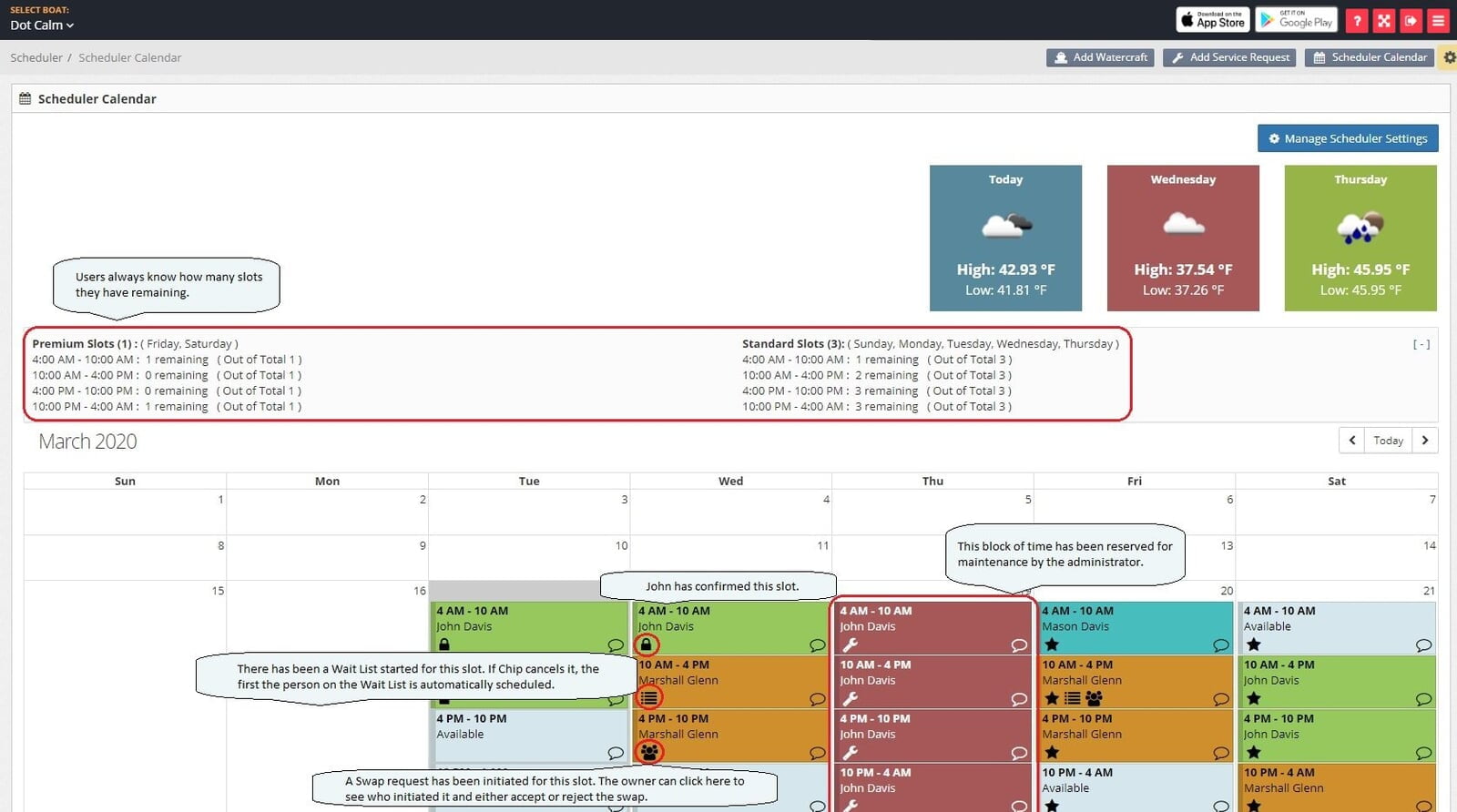 The Yacht management portal will be available to all members. Members will schedule usage with the online calendar tools. Monthly financial and maintenance reports will be sent to all members and yacht location will be updated in real time.